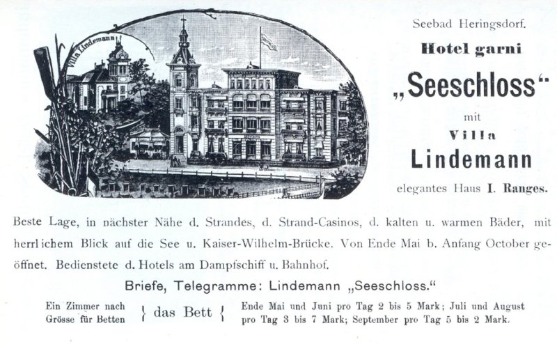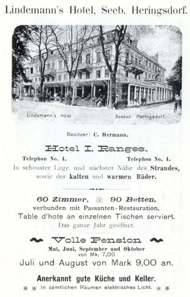 Das im Jahre 1865/66 als "Lindemanns Hotel" erbaute Gebäude erhielt zu Ehre seines Erbauers auch dessen Namen als „Lindemanns Hotel“.Es war nicht das erste Hotel im aufstrebenden Badeort. Das äußerst vornehme Hotel beherbergte viele bekannte Gäste.