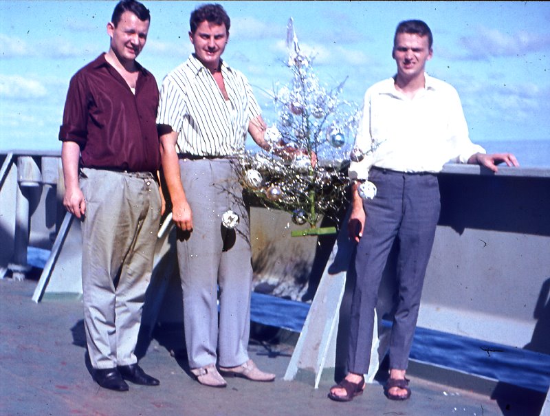 unser Baum an DeckEine Weihnachtsüberraschung der besonderen Art ist mir in bleibender Erinnerung geblieben. Mit großem Aufwand waren Angehörige des Betriebsleitung schon weit vor Auslaufen des Schiffes aktiv. Hierzu setzten diese sich heimlich mit den nächsten Familienangehörigen in Verbindung und machte Aufzeichnungen mit Weihnachtsgrüssen an die Angehörigen auf dem Schiff. Diese Aufzeichnungen wurden dann ohne Vorwarnung während der Feierstunde durch den Lautsprecher übertragen. Noch heute höre ich die zittrige Stimme meiner Eltern durch den Lautsprecher klingen! Anderen Besatzungsmitgliedern standen Tränen in den Augen als sie die guten Wünsche ihrer Kinder und Liebsten hörten. Die Ehefrauen kannten natürlich auch die kleinen Schwächen ihrer Männer und so gab es auch kleine Ermahnungen, die zumindest für einige Tage ihre Wirkung nicht verfehlten.