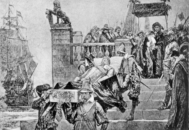 Nach dem Tod von Gustav Adolf wurde dieser im Wolgaster Schloss aufgebahrt und nach Schweden überführt. (Abbildung auf dem Marktbrunnen in Wolgast)