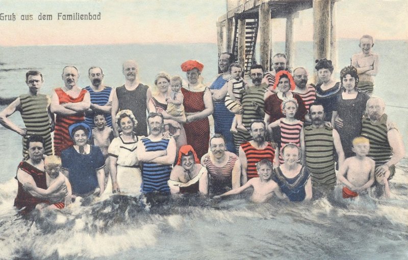 „Aber es dauerte nicht lange, da lockerten sich auch die strengen Sitten in den Familienbädern und die neuen Badekostüme aus dünner Baumwolle konnten ihre erotischen Reize entfalten“, fuhr Tante Trude fort. „Der quer gestreifte Schwimmanzug wurde schon um 1860 in England erfunden und setzte sich von dort mit erheblicher Verzögerung auch auf dem Kontinent durch.